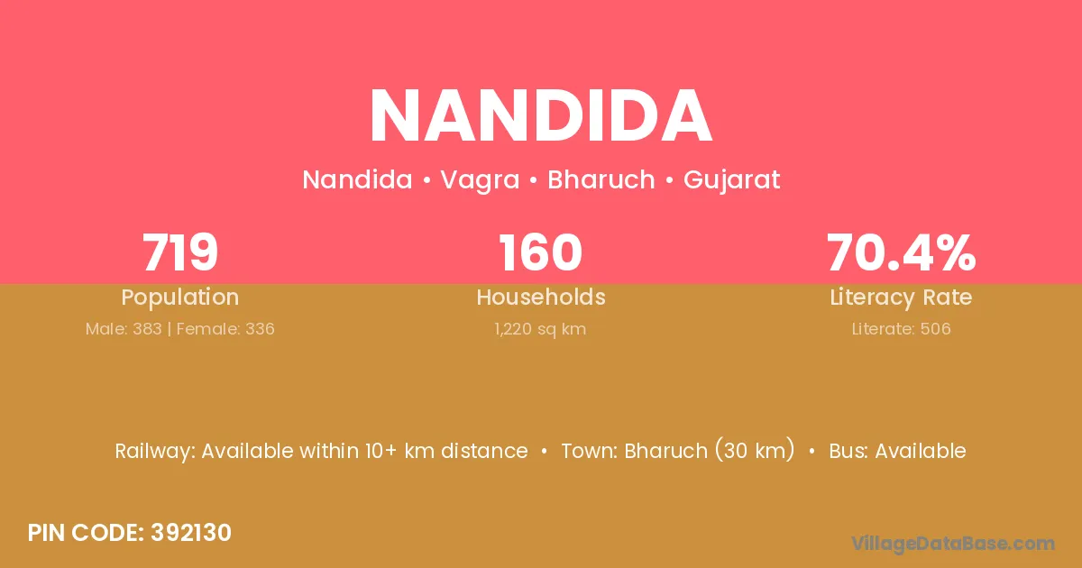 Bharuch (30 km) is the nearest town to Nandida village for major economic activities and is located approximately 30 km away.
