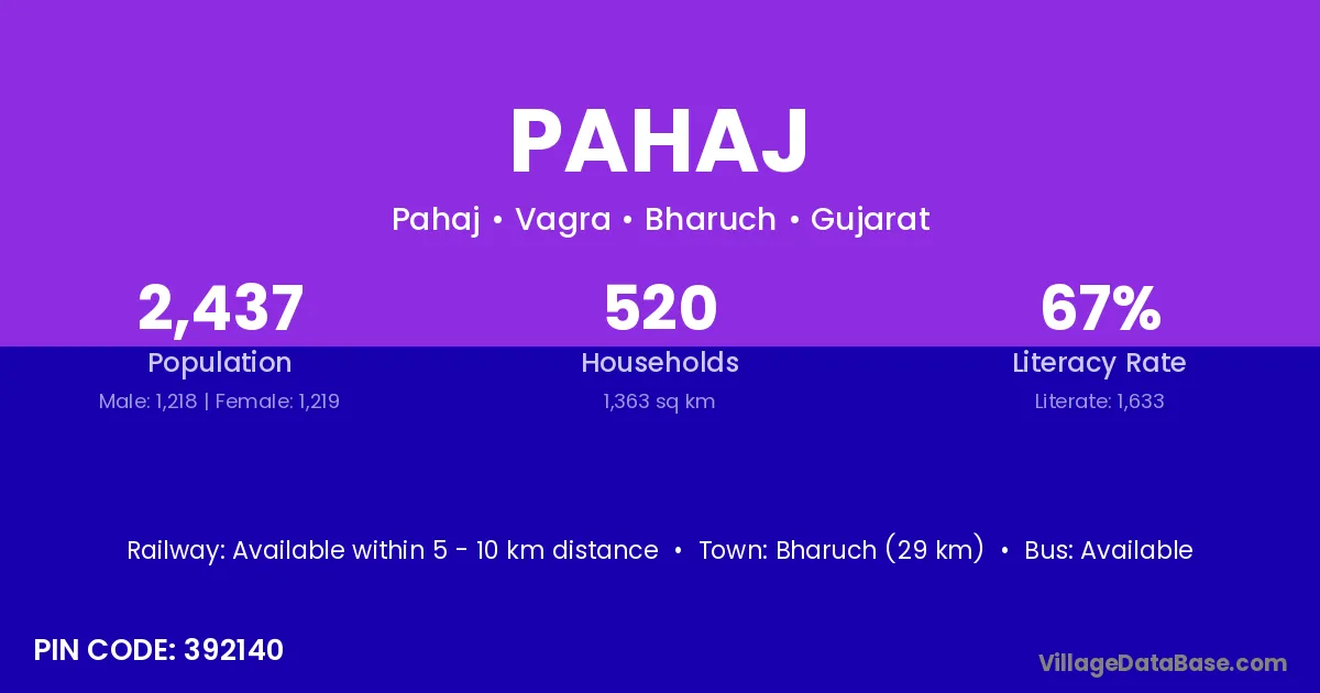 Bharuch (29 km) is the nearest town to Pahaj village for major economic activities and is located approximately 29 km away.