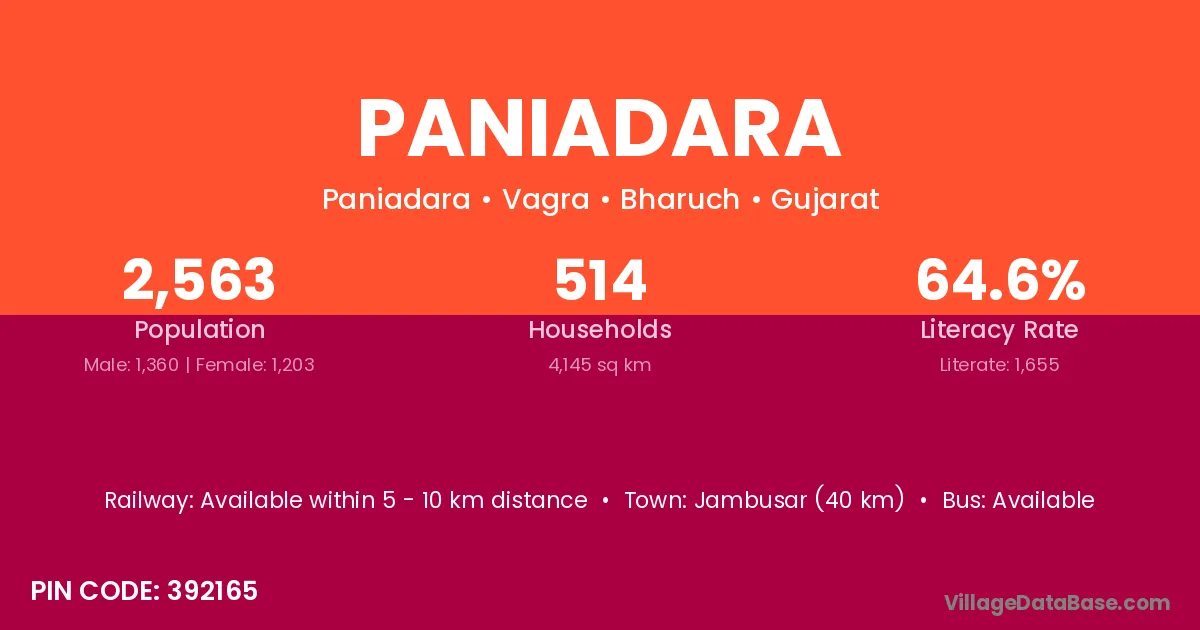 Jambusar (40 km) is the nearest town to Paniadara village for major economic activities and is located approximately 40 km away.
