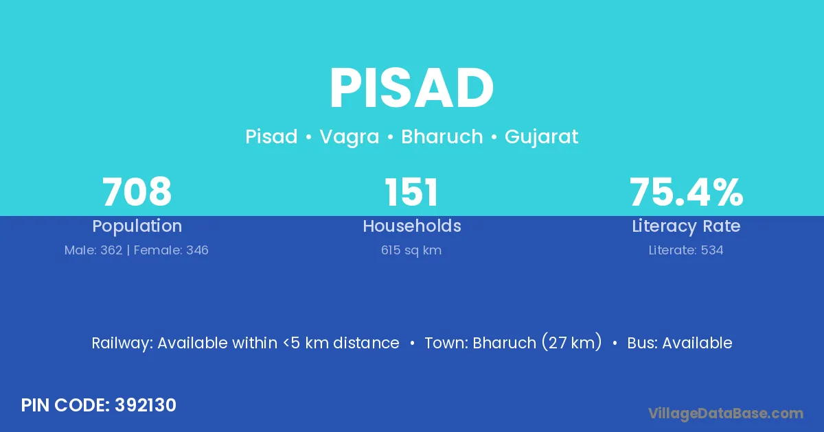 Bharuch (27 km) is the nearest town to Pisad village for major economic activities and is located approximately 27 km away.