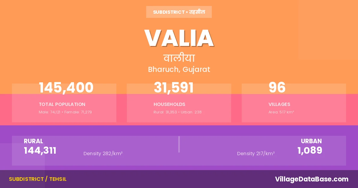 According to the 2011 census The total area of Valia Taluka is 517 km², with a population of 145400 people. The population density is 281 inhabitants per square kilometre, and there are approximately 31591 houses in the sub district.