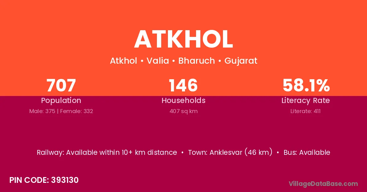 Anklesvar (46 km) is the nearest town to Atkhol village for major economic activities and is located approximately 46 km away.