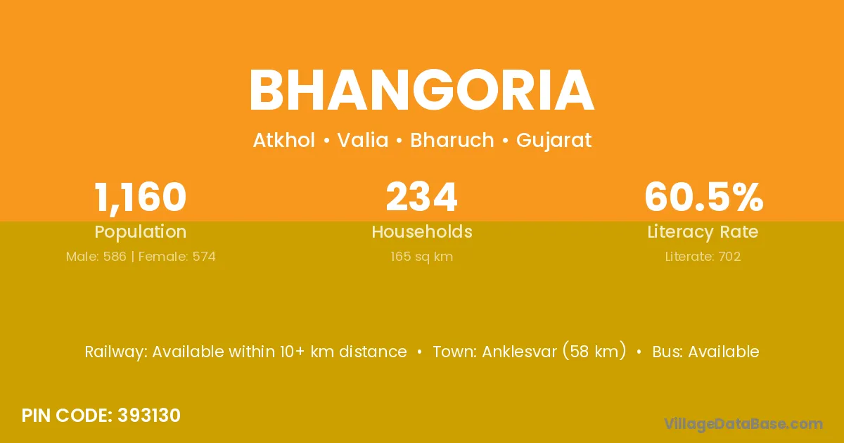 Anklesvar (58 km) is the nearest town to Bhangoria village for major economic activities and is located approximately 58 km away.