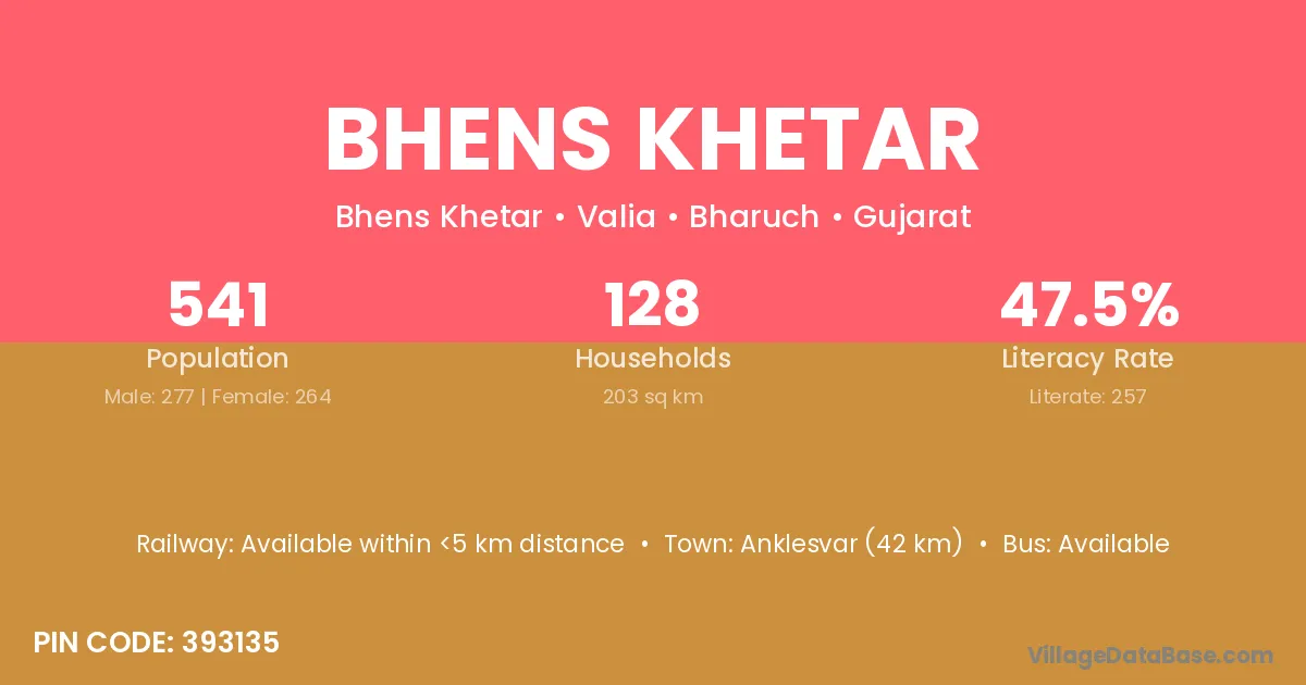 Anklesvar (42 km) is the nearest town to Bhens Khetar village for major economic activities and is located approximately 42 km away.