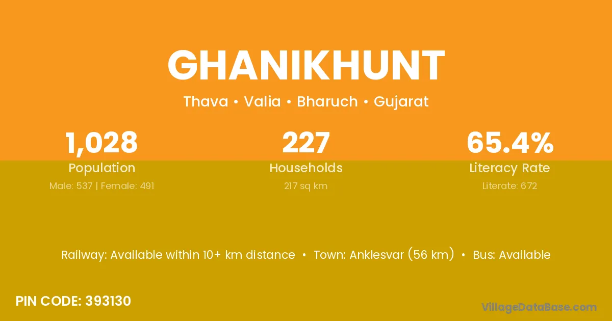 Anklesvar (56 km) is the nearest town to Ghanikhunt village for major economic activities and is located approximately 56 km away.