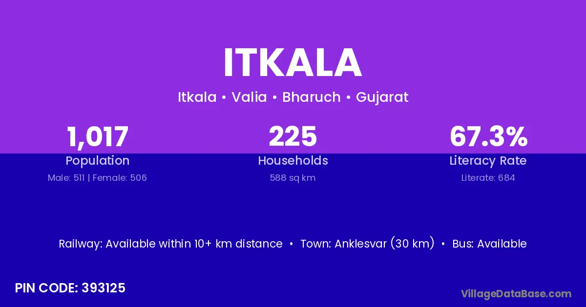Anklesvar (30 km) is the nearest town to Itkala village for major economic activities and is located approximately 30 km away.