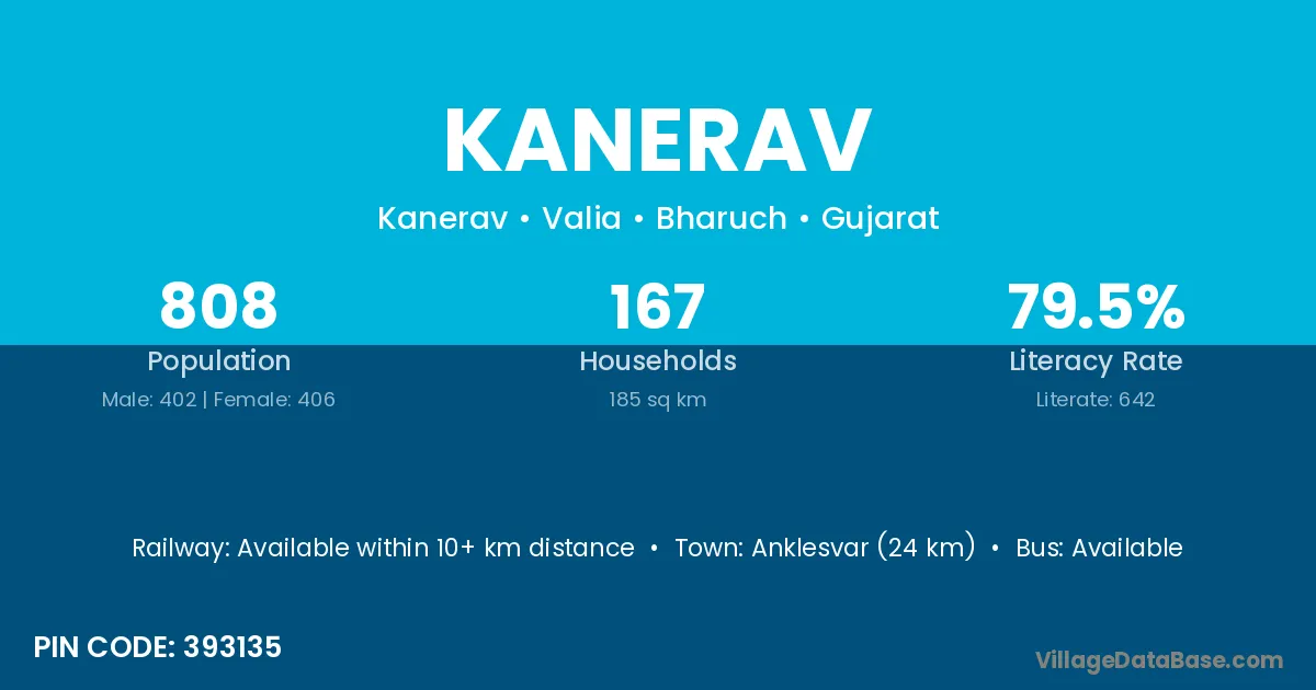 Anklesvar (24 km) is the nearest town to Kanerav village for major economic activities and is located approximately 24 km away.