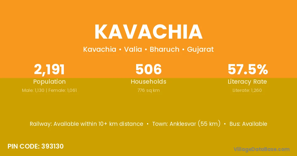 Anklesvar (55 km) is the nearest town to Kavachia village for major economic activities and is located approximately 55 km away.