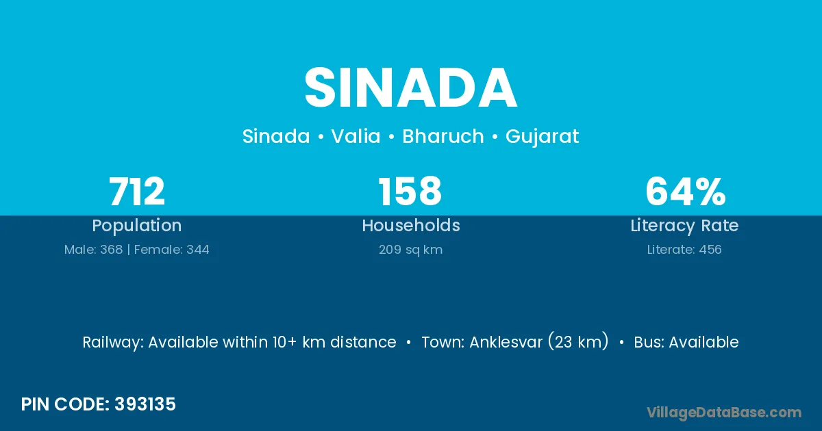 Anklesvar (23 km) is the nearest town to Sinada village for major economic activities and is located approximately 23 km away.