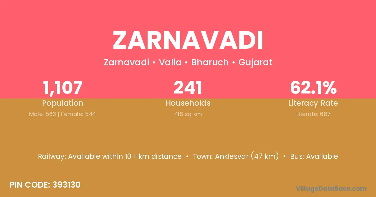 Anklesvar (47 km) is the nearest town to Zarnavadi village for major economic activities and is located approximately 47 km away.