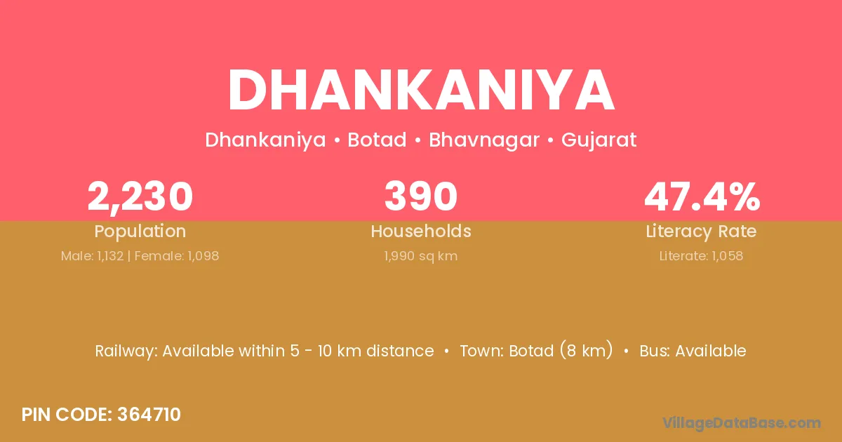 Botad (8 km) is the nearest town to Dhankaniya village for major economic activities and is located approximately 8 km away.