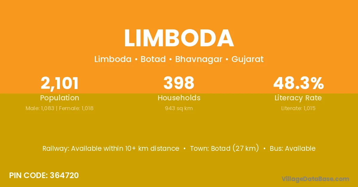 Botad (27 km) is the nearest town to Limboda village for major economic activities and is located approximately 27 km away.