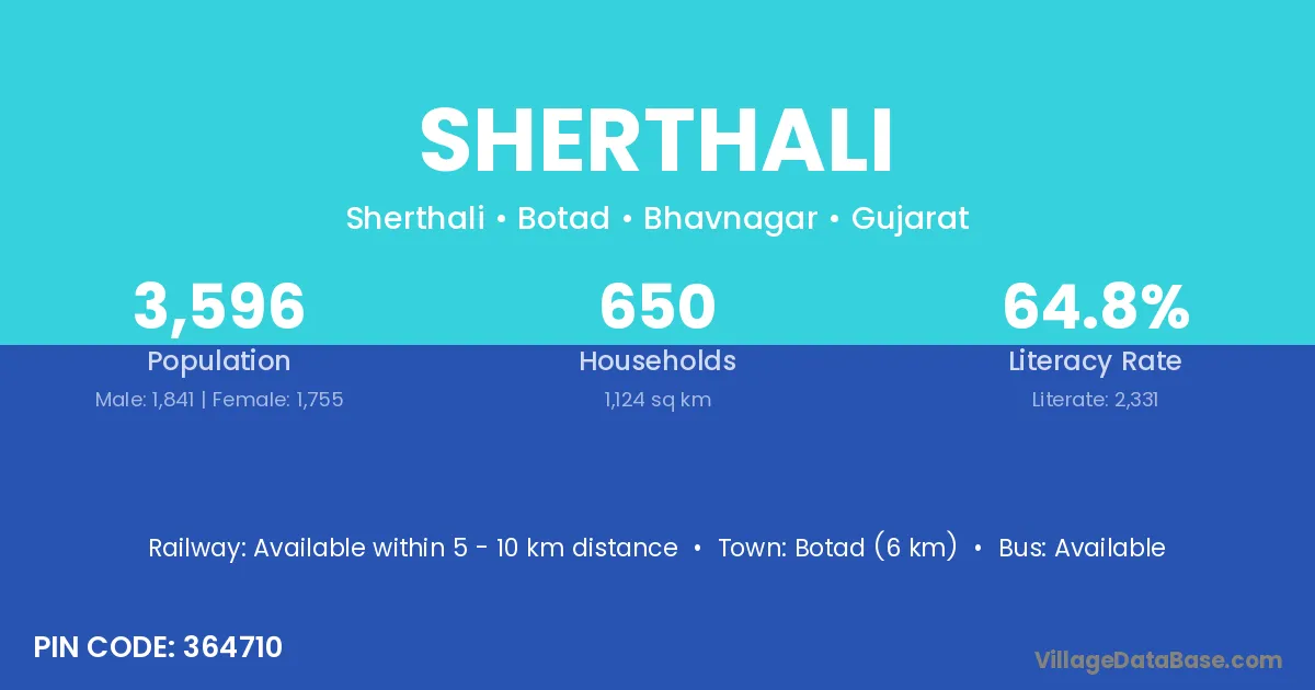 Botad (6 km) is the nearest town to Sherthali village for major economic activities and is located approximately 6 km away.
