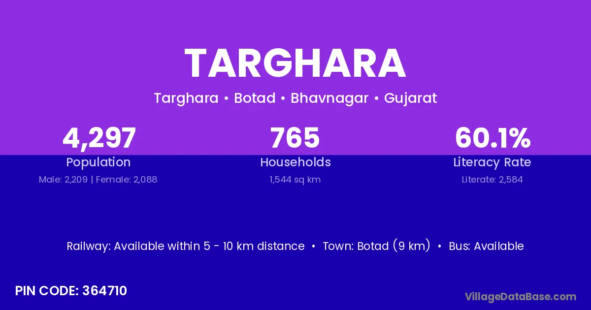Botad (9 km) is the nearest town to Targhara village for major economic activities and is located approximately 9 km away.