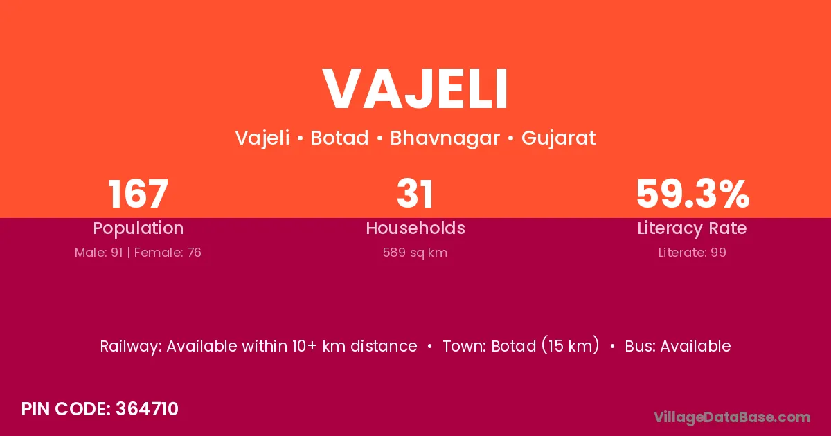 Botad (15 km) is the nearest town to Vajeli village for major economic activities and is located approximately 15 km away.
