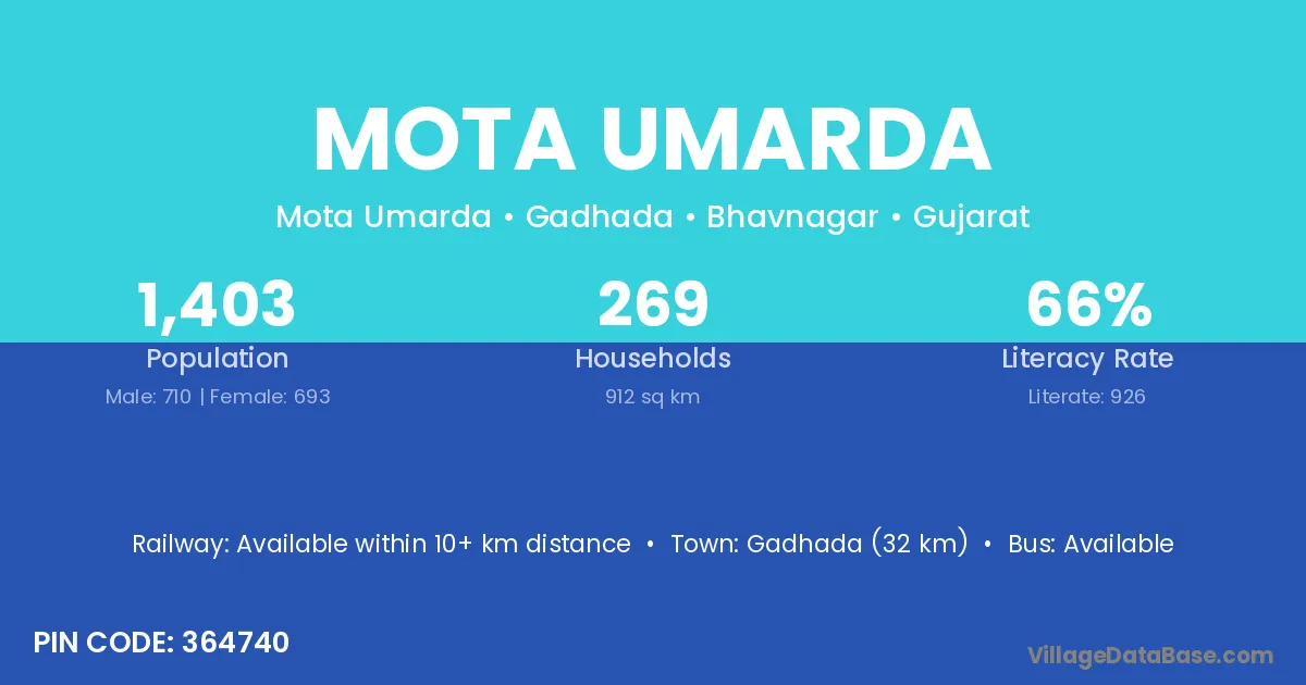 Gadhada (32 km) is the nearest town to Mota Umarda village for major economic activities and is located approximately 32 km away.
