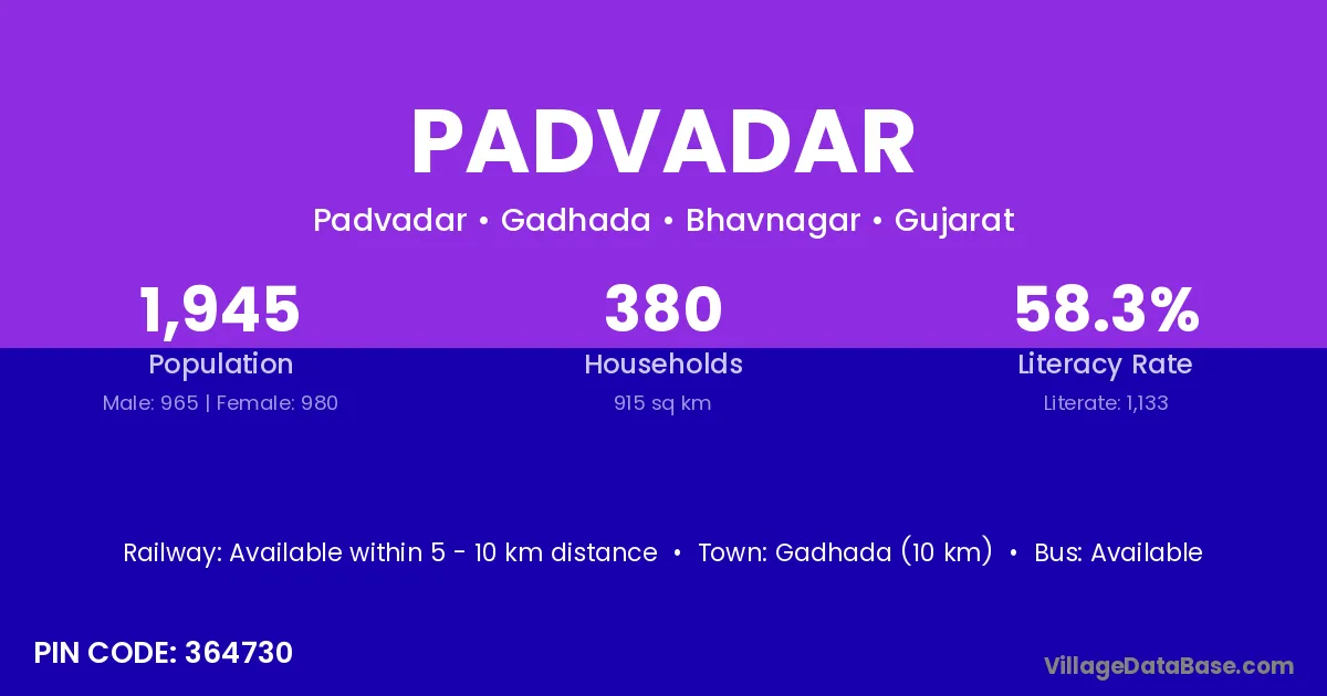 Gadhada (10 km) is the nearest town to Padvadar village for major economic activities and is located approximately 10 km away.