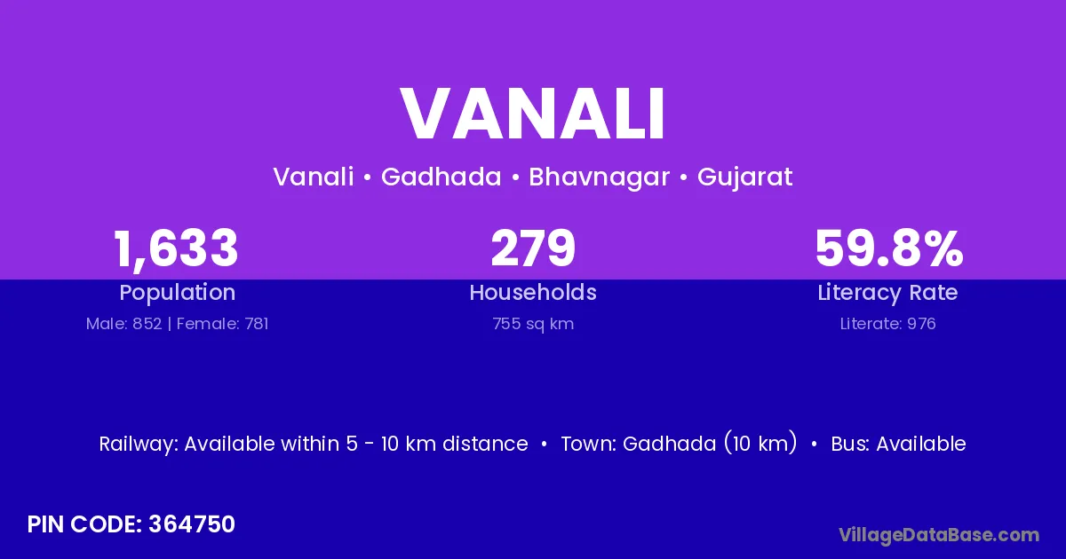 Gadhada (10 km) is the nearest town to Vanali village for major economic activities and is located approximately 10 km away.