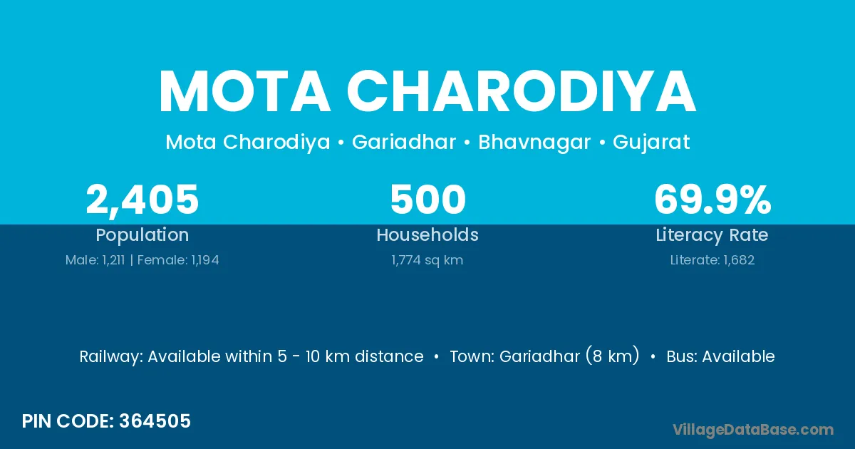 Gariadhar (8 km) is the nearest town to Mota Charodiya village for major economic activities and is located approximately 8 km away.