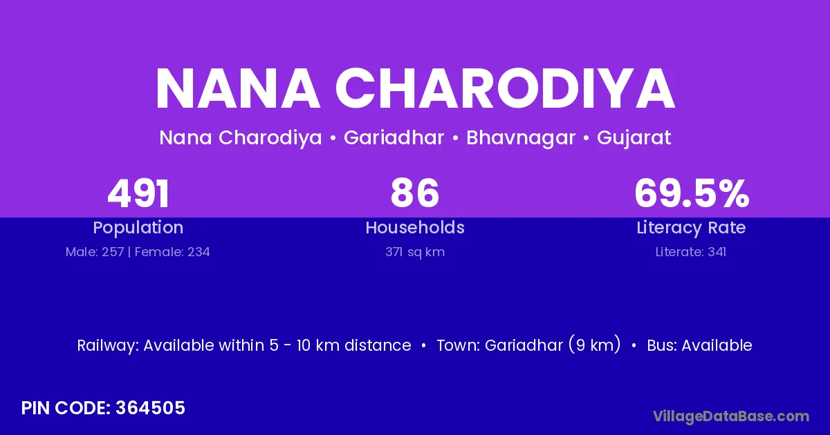 Gariadhar (9 km) is the nearest town to Nana Charodiya village for major economic activities and is located approximately 9 km away.