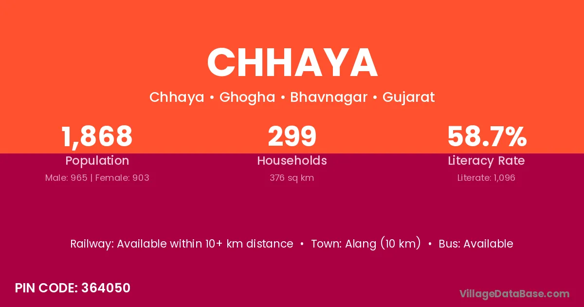 Alang (10 km) is the nearest town to Chhaya village for major economic activities and is located approximately 10 km away.