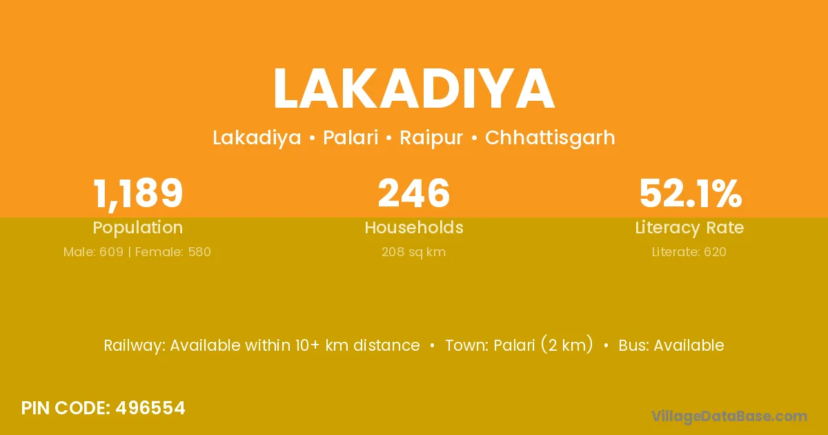 Lakadiya village has a total population of 1,140 people, of which 581 are males and 559 are females.