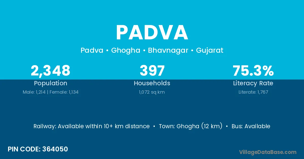Ghogha (12 km) is the nearest town to Padva village for major economic activities and is located approximately 12 km away.