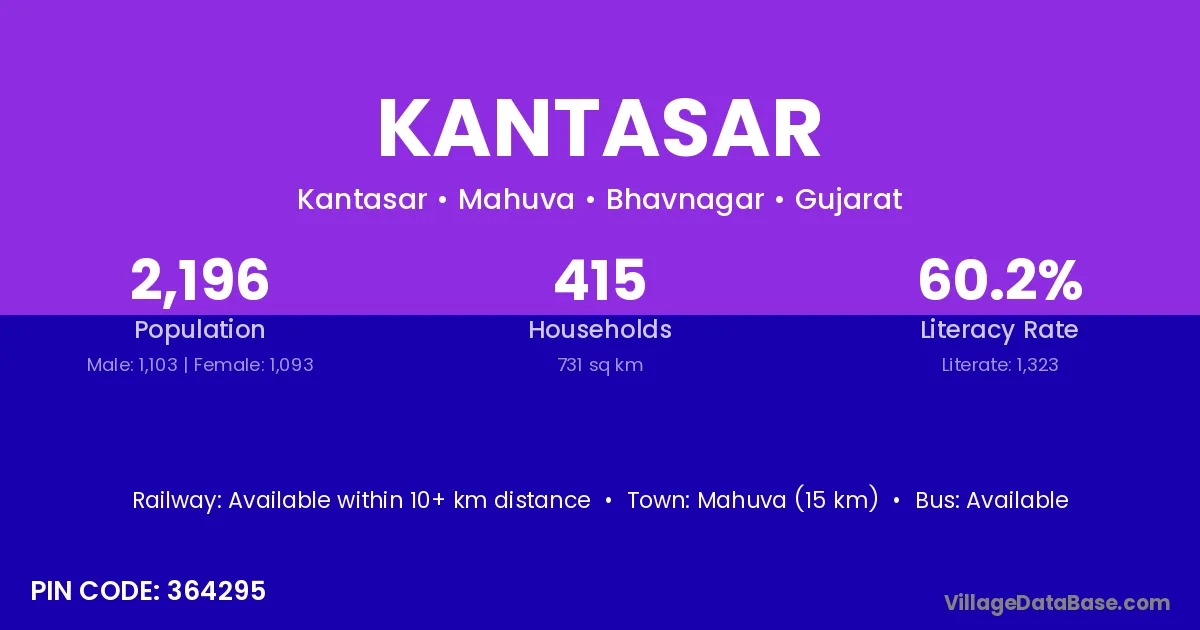Mahuva (15 km) is the nearest town to Kantasar village for major economic activities and is located approximately 15 km away.