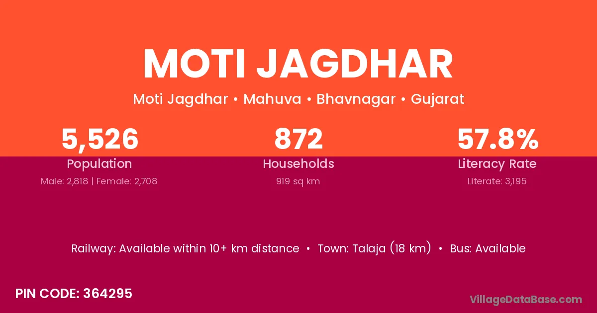 Talaja (18 km) is the nearest town to Moti Jagdhar village for major economic activities and is located approximately 18 km away.