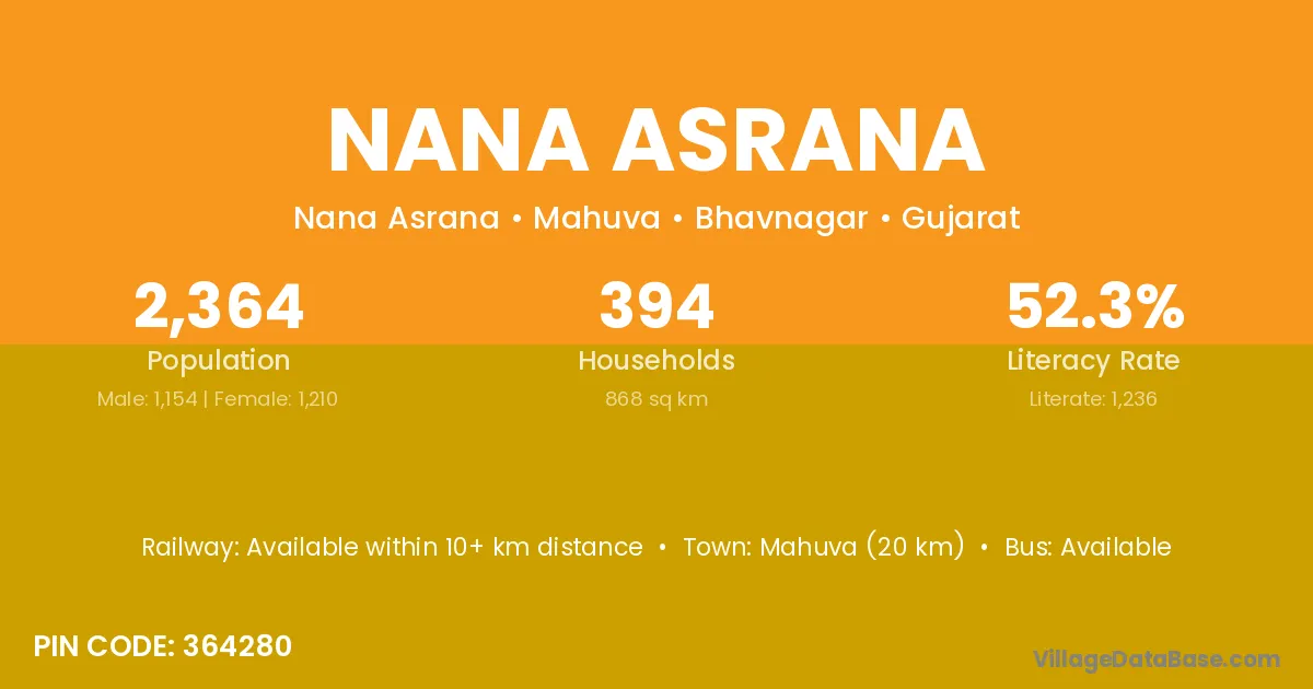 Mahuva (20 km) is the nearest town to Nana Asrana village for major economic activities and is located approximately 20 km away.