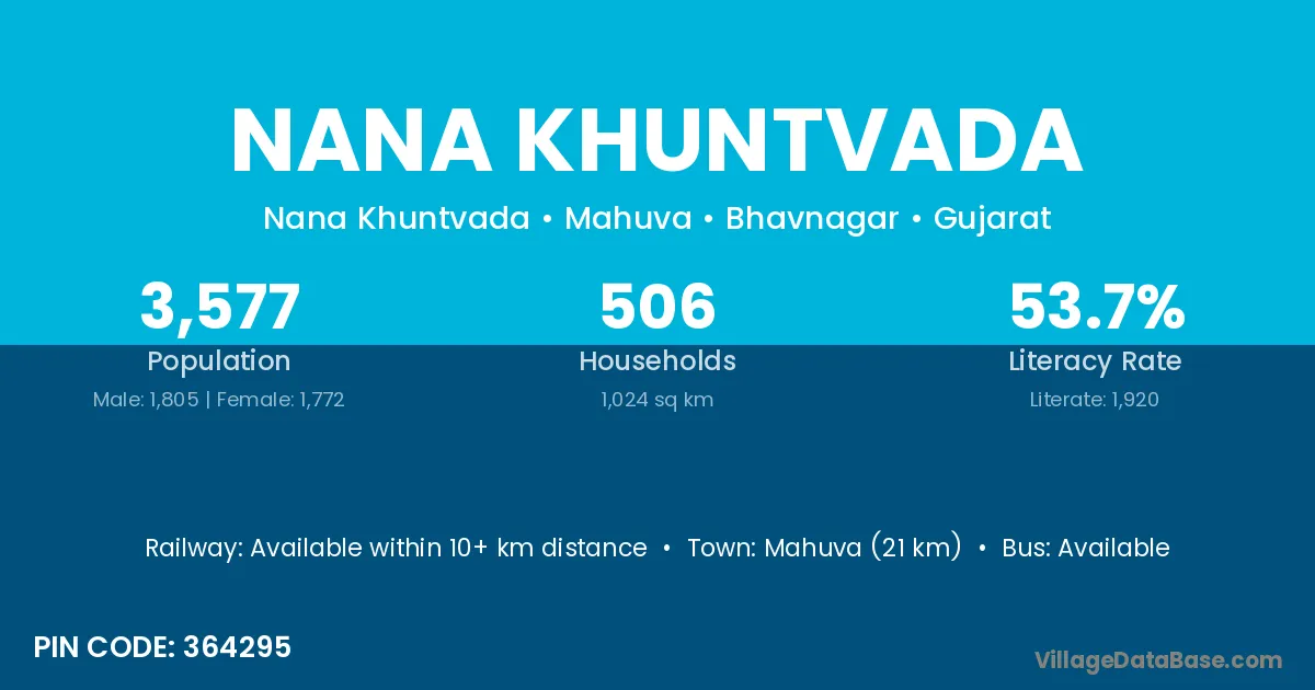 Mahuva (21 km) is the nearest town to Nana Khuntvada village for major economic activities and is located approximately 21 km away.