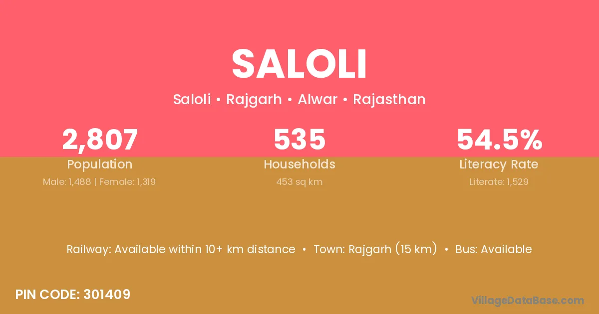 The literacy rate of Saloli village is 58.20%. Male literacy stands at 68.42% and female literacy at 48.58%.