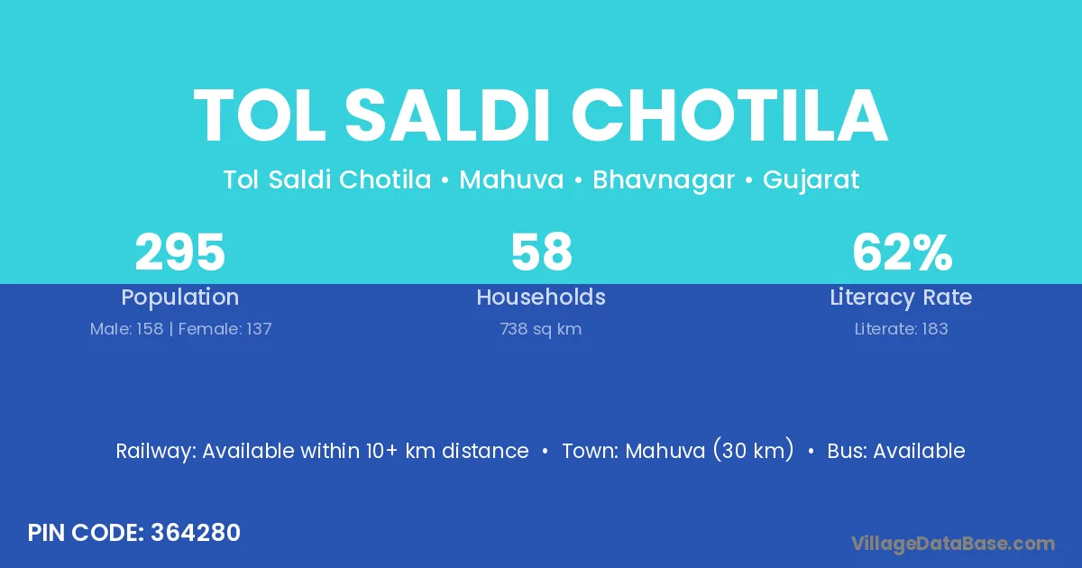 Mahuva (30 km) is the nearest town to Tol Saldi Chotila village for major economic activities and is located approximately 30 km away.