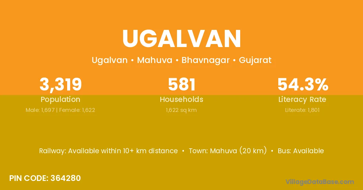 Mahuva (20 km) is the nearest town to Ugalvan village for major economic activities and is located approximately 20 km away.