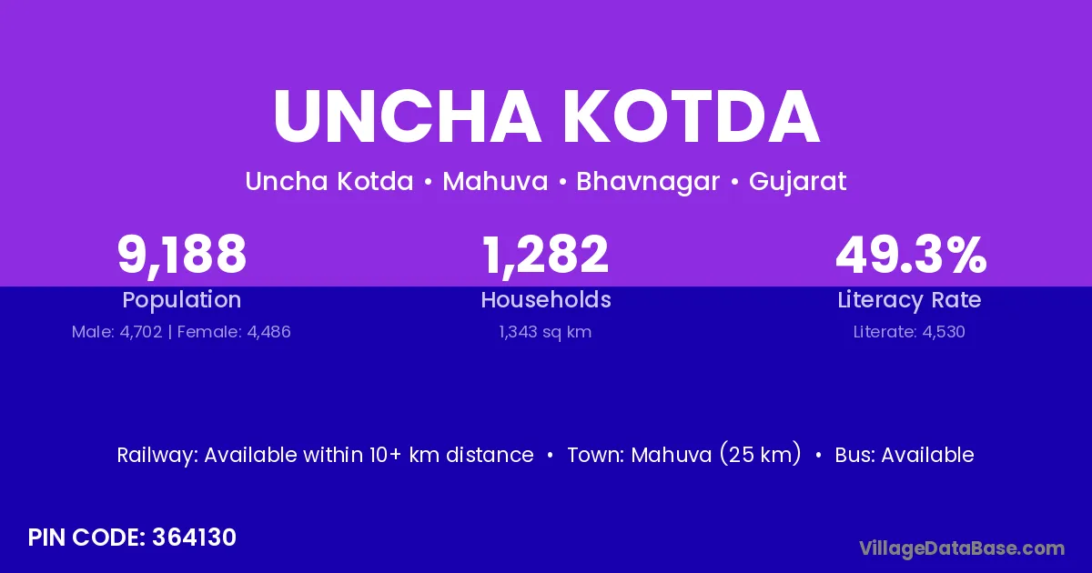 Mahuva (25 km) is the nearest town to Uncha Kotda village for major economic activities and is located approximately 25 km away.