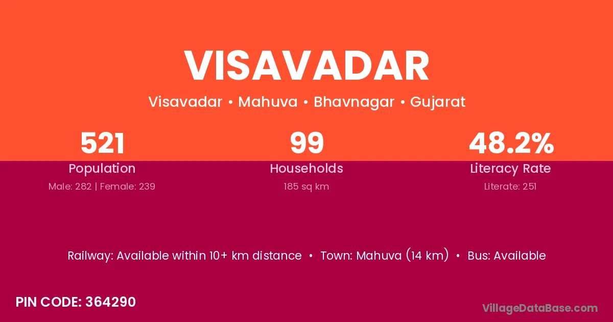 Mahuva (14 km) is the nearest town to Visavadar village for major economic activities and is located approximately 14 km away.
