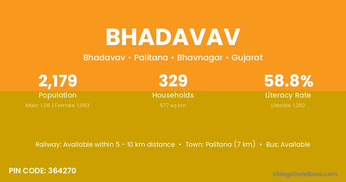 Palitana (7 km) is the nearest town to Bhadavav village for major economic activities and is located approximately 7 km away.