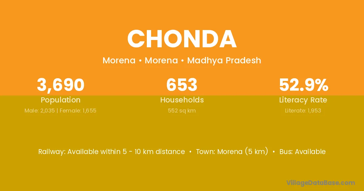 The literacy rate of Chonda village is 87.20%. Male literacy stands at 87.86% and female literacy at 86.58%.