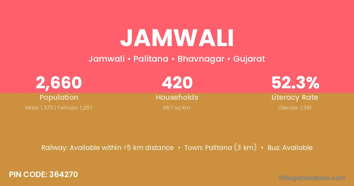 Palitana (3 km) is the nearest town to Jamwali village for major economic activities and is located approximately 3 km away.