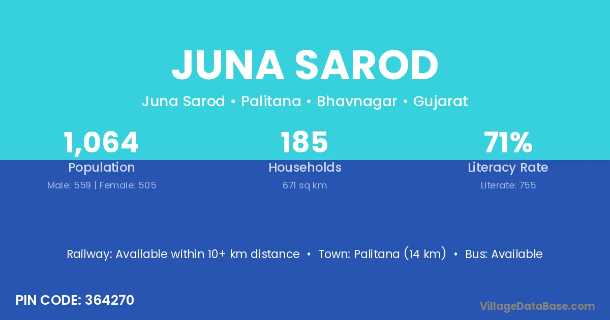 Palitana (14 km) is the nearest town to Juna Sarod village for major economic activities and is located approximately 14 km away.