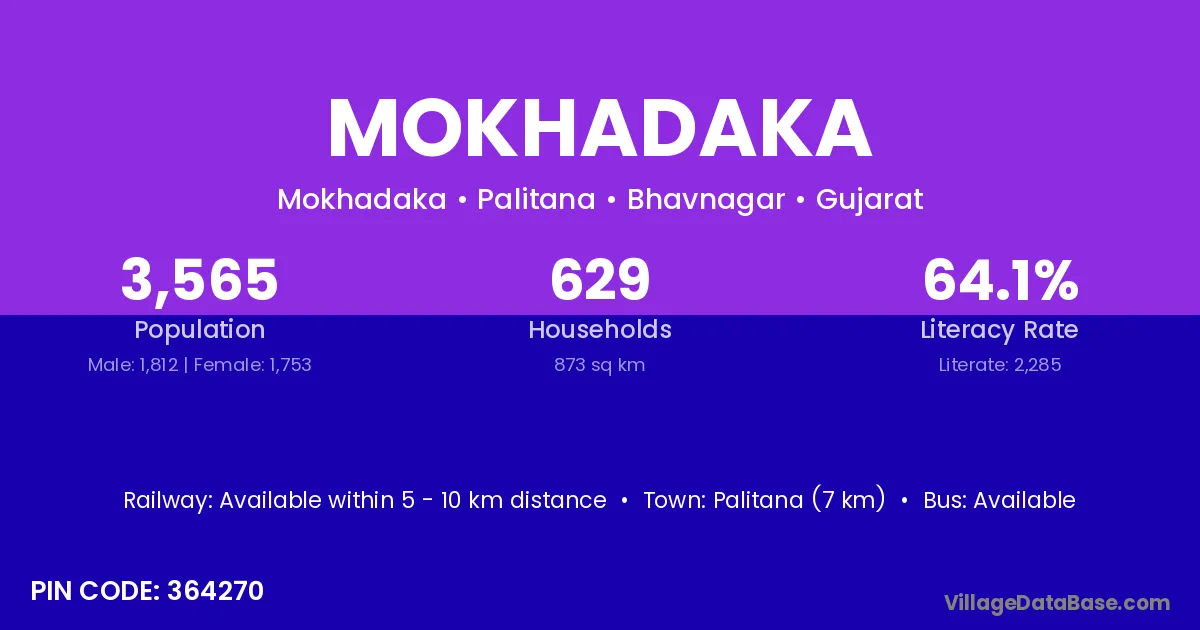 Palitana (7 km) is the nearest town to Mokhadaka village for major economic activities and is located approximately 7 km away.