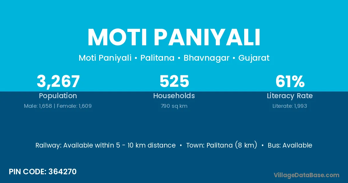 Palitana (8 km) is the nearest town to Moti Paniyali village for major economic activities and is located approximately 8 km away.