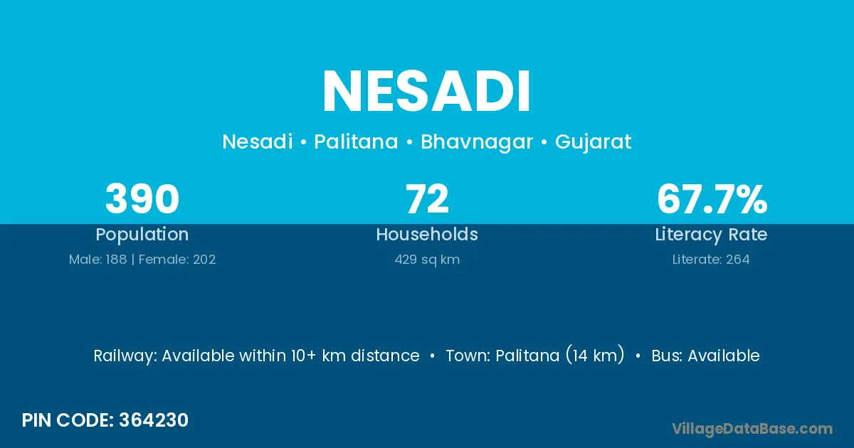 Palitana (14 km) is the nearest town to Nesadi village for major economic activities and is located approximately 14 km away.