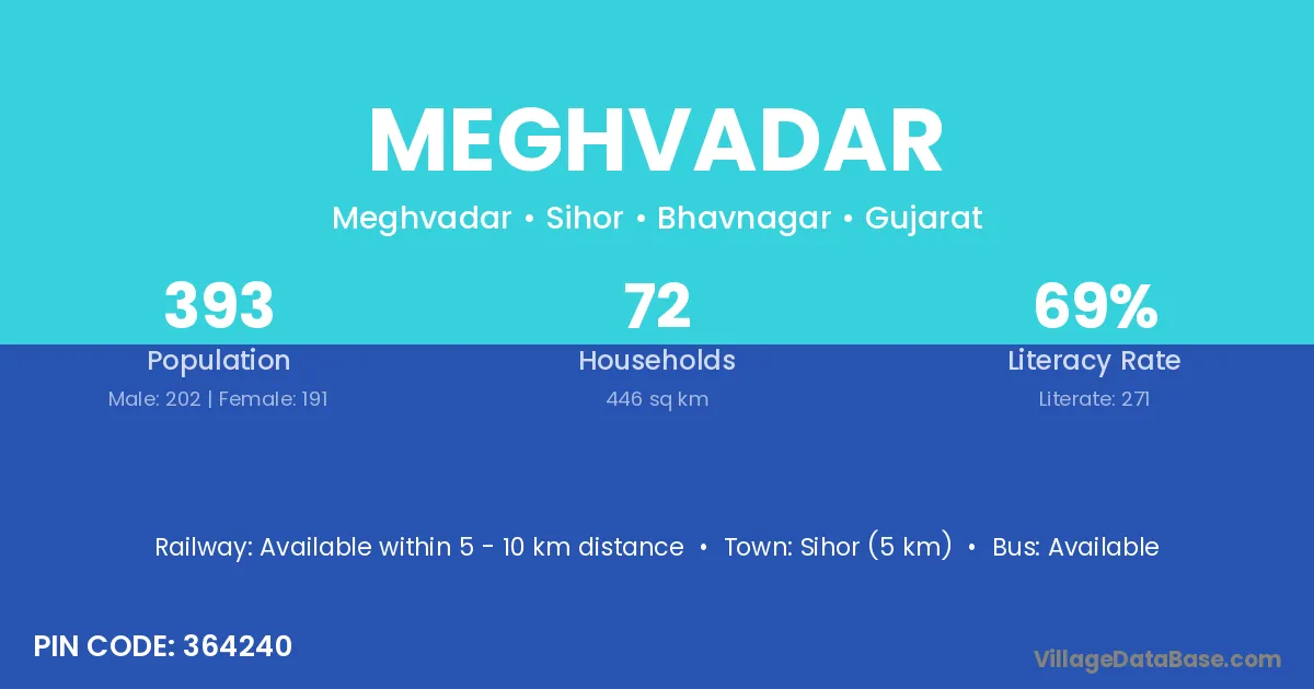 Sihor (5 km) is the nearest town to Meghvadar village for major economic activities and is located approximately 5 km away.
