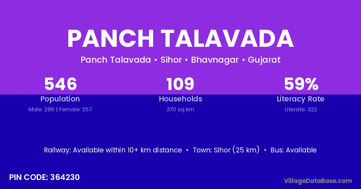 Sihor (25 km) is the nearest town to Panch Talavada village for major economic activities and is located approximately 25 km away.