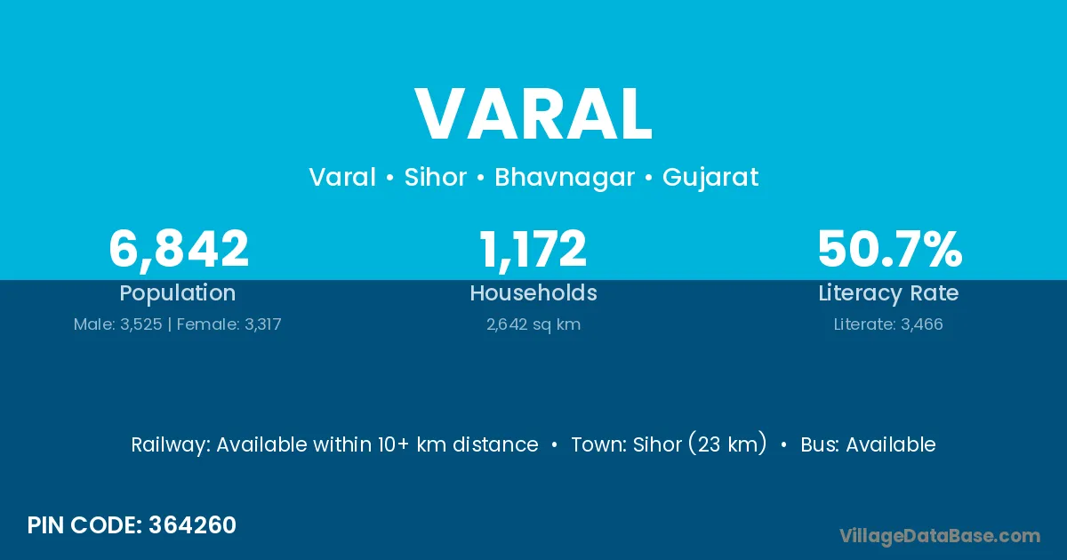 Sihor (23 km) is the nearest town to Varal village for major economic activities and is located approximately 23 km away.