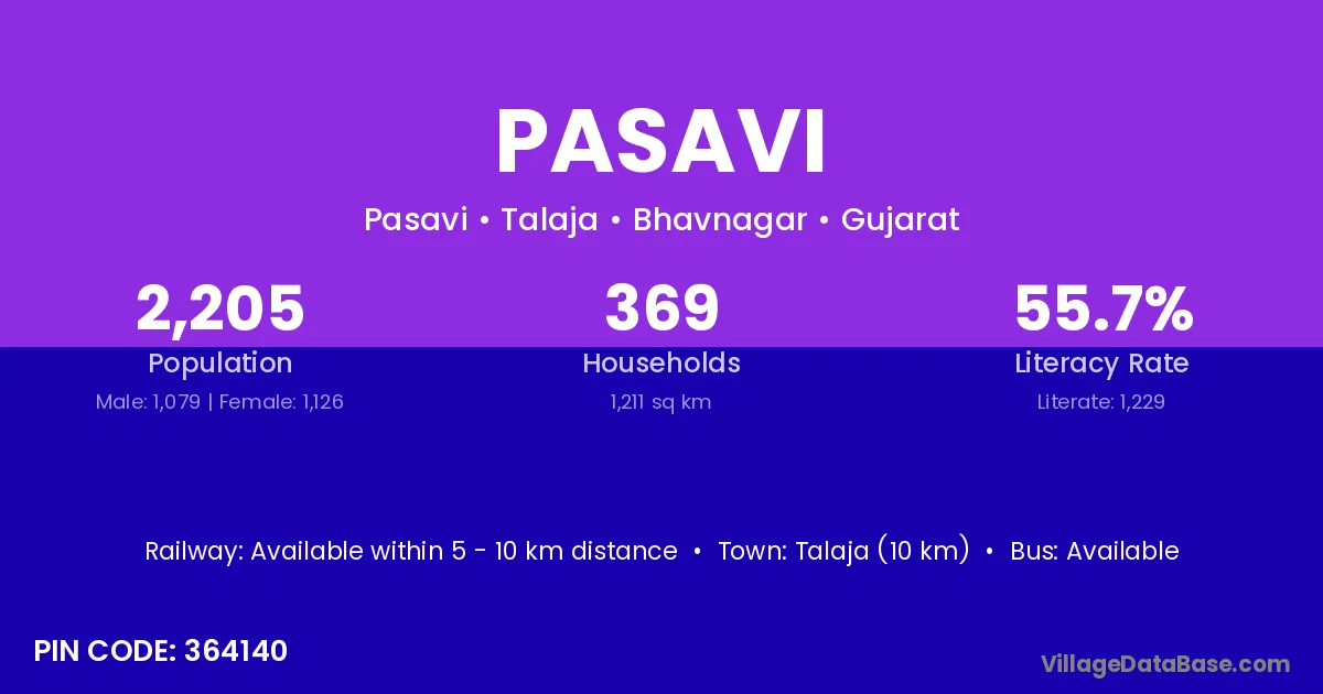 Talaja (10 km) is the nearest town to Pasavi village for major economic activities and is located approximately 10 km away.