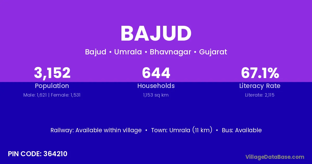 Umrala (11 km) is the nearest town to Bajud village for major economic activities and is located approximately 11 km away.