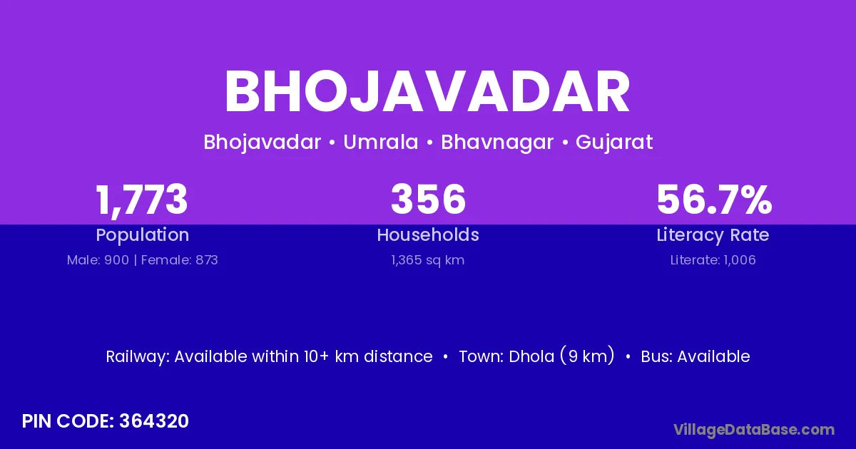 Dhola (9 km) is the nearest town to Bhojavadar village for major economic activities and is located approximately 9 km away.