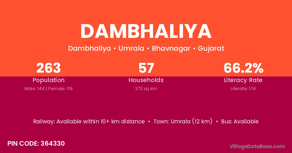 Umrala (12 km) is the nearest town to Dambhaliya village for major economic activities and is located approximately 12 km away.